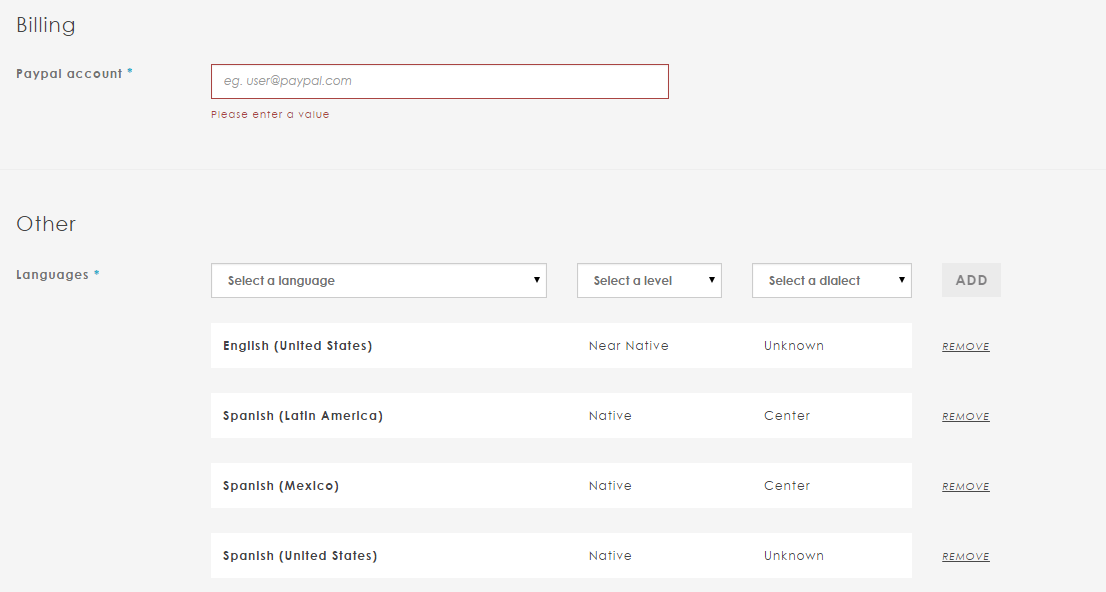 -Llenar su perfil, sobre todo la sección de su cuenta de paypal y los lenguajes que hablan, debería verse así