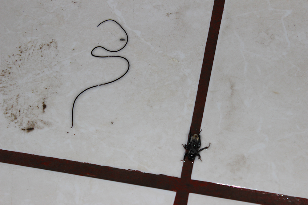 ¿A que me refiero? Pues a una historia de la naturaleza bastante escalofriante: resulta que estos insectos son parasitados por un tipo de gusano llamado " Pelo de Caballo ", que, al alcanzar su maximo tamaño dentro de este, los "controla", orillandolos a buscar una fuente de agua en la que se tiran y al hacerlo, este parasito revienta su vientre para salir y continuar su ciclo de vida.