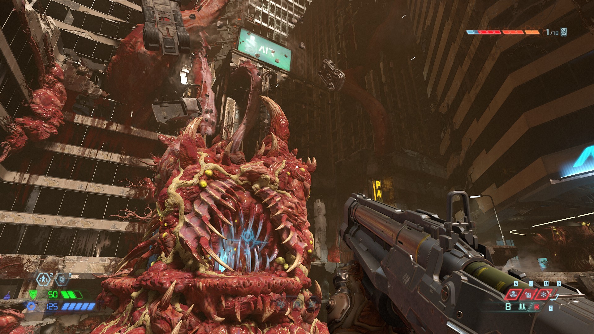Yo le he estado dando al DOOM Eternal. Tiene sus detalles, el más castroso es lo limitado de la munición por lo que hay que estar partiendo enemigos con la motosierra para que, como piñata, caigan las municiones. Es un triple sistema donde si flameas a los enemigos dan armadura, la motosierra munición y las ejecuciones salud, pero ese ciclo de gameplay no me parece muy Doom que digamos, es decir, cargas putimil armas pero sólo puedes guardar, después de actualizar toda la barra de municiones, 24 cartuchos de escopeta?... no mams, en el Doom original traes 50 de inicio.
