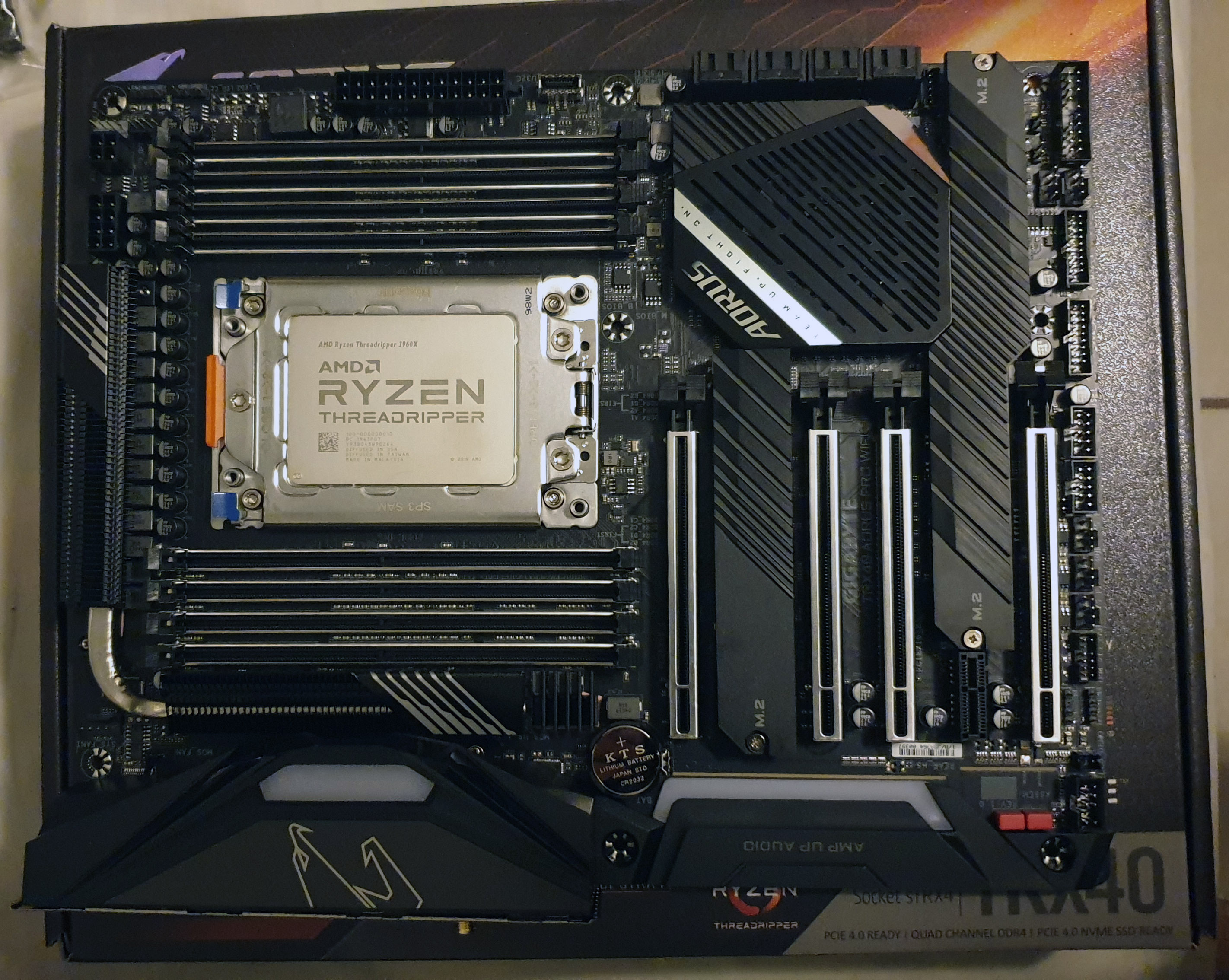 es un a Gigabyte Aorus PRO WIFI TRX40, un AMD 3960X, un SSD generico bien bara PCIE4 y unas memos kingston 4200 B Die