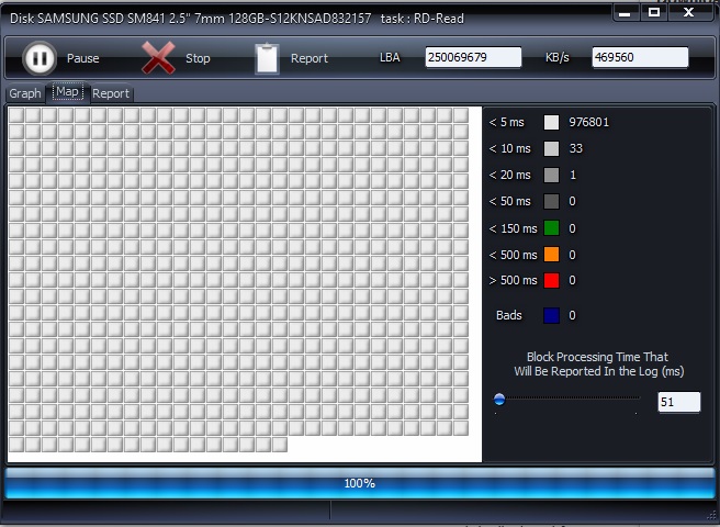 Yo para revisar si está madreado un disco uso HDDScan en modo verify, aunque en modo read también da buenos resultados y es más rapido. Usualmente lo uso para HDDs, mientras revisa el disco te da un grafico de rendimiento y otro grafico que te que calidad tiene el sector que acaba de leer, también hay un apartado donde te da un resumen de aquellos sectores que no tienen un performance optimo.