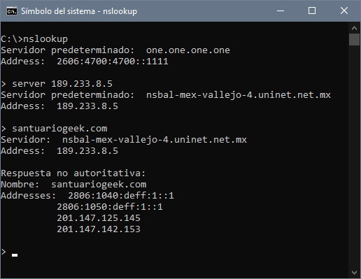 El DNS que Telmex configura en su router tiene la IP 189.233.8.5, comprobemos que en efecto está enviando el tráfico de santuariogeek.com a otro lado: