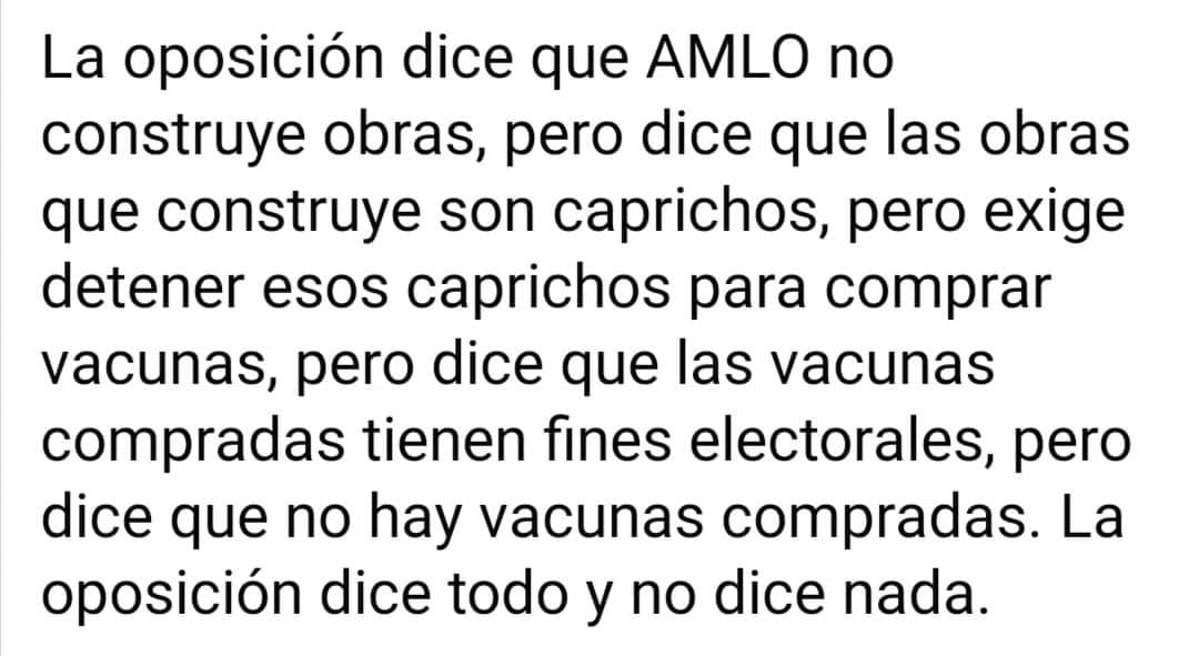 Entonces no ve vengan con "los fifis quieren todo", no, los que nos oponemos no queremos todo, solamente queremos un rumbo claro, y que no se vea que las cosas las hacen con el culo y de último minuto, esto con todo, ya sea la vacunación, la economia, la energía.