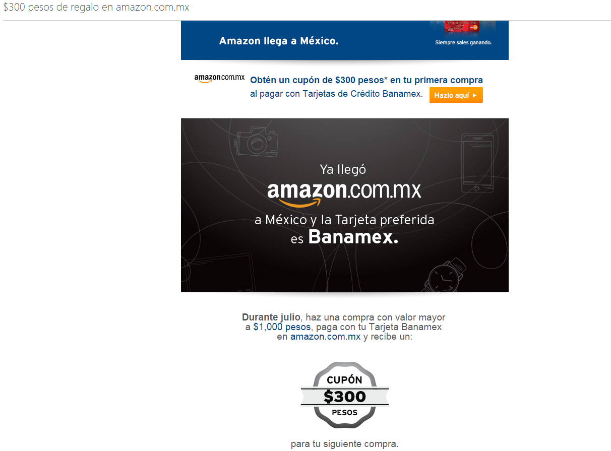 Aplica durante Julio.Para recibir el cupón son en productors "enviados y vendidos por Amazon" por un monto de 1K. Tardan "hasta" 50 días en darte el cupón. Son $300 con vigencia al 30 de Septiembre15. Y para redimir el cupón en la siguiente compra tienes que hacer otra compra de 1K.