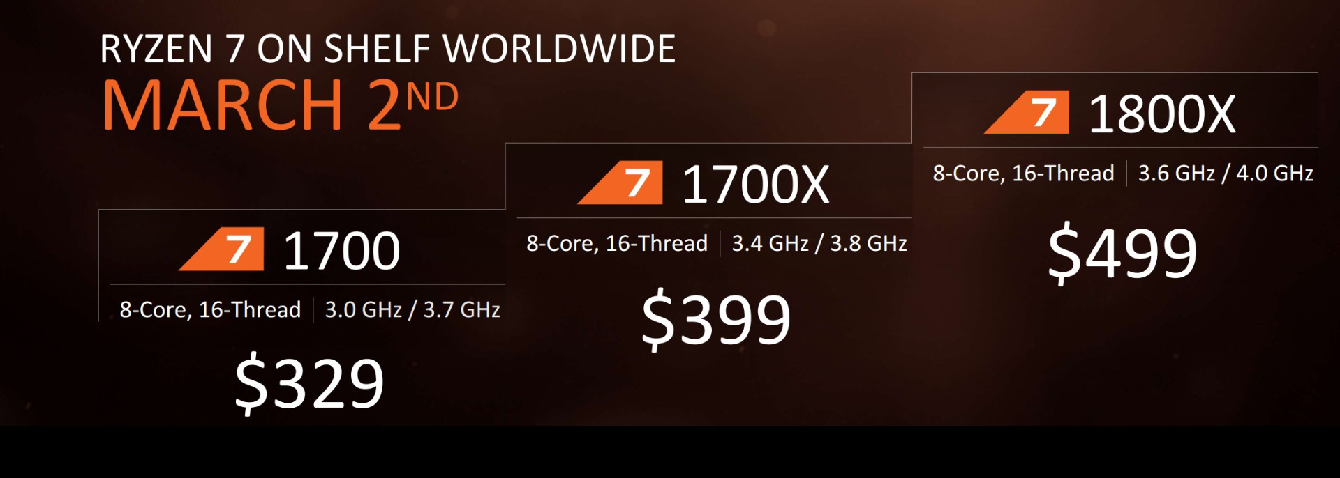 Diaboliquin wrote: Por fin AMD anunció la fecha de salida del Ryzen: 2 de Marzo. Los primeros en salir a la venta serán los Ryzen 7 1800X / 1700X / 1700. Sus precios son de $499 USD, $399 USD y $329 USD respectivamente. Todos estos procesadores tienen 8 núcleos/16 hilos de ejecución. A partir de hoy se pueden pre-ordenar en tiendas como NewEgg .