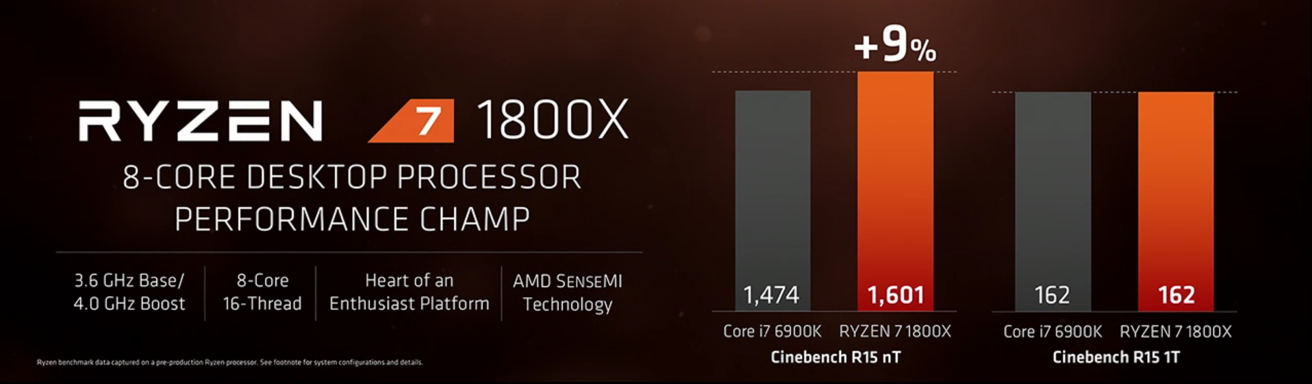 Los benchmarks de terceros aparecerán también el 2 de marzo. Las pruebas internas de AMD indican que su 1800X tiene un desempeño similar a un Intel Core i7-6900K, claro que donde le pasa por encima es en el precio porque el Core i7 cuesta el doble (+$1,000 dolarucos).