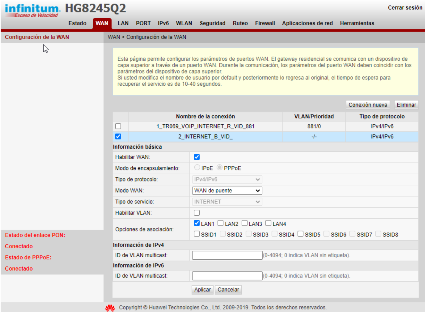 Si entiendo bien lo que dices es que ya no se puede tener telefono y una configuracion modo puente a la vez?La configuración que permitía tener 2 conexiones ya no está disponible, ya hice muchas pruebas y ahora solo es posible establecer una conexión por puerto asignado a cada usuario, ya no será posible mantener la conexión de la ONT para no perder el servicio VoIP y usar un Router personal en modo puente para gestionar las conexión a internet. Lamentablemente algunas personas no solo mantenían el servicio VoIP sino que hacían uso de la conexión a internet disponible en la ONT o directamente conectaban más de un Router en modo puente. Ahora va a tocar elegir mantener el servicio VoIP y una mala gestión para la conexión a internet, o perder el servicio VoIP y usar un buen Router para gestionar bien la conexión a internet.