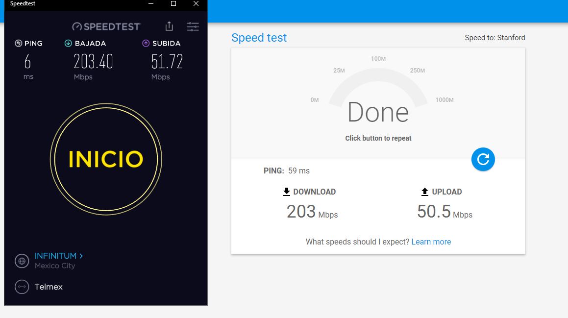 Pero bueno, apagué y volví a encender el router y ya tengo la nueva velocidad con el extra. Es el paquete de $549 de puro internet. Hasta la semana pasada era el que daba 100/10Mbs y que desde el viernes subió a 150Mbs (no sé bien su subida) para actualmente quedar en 200-205/20Mbs.
