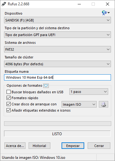 Un problema común en equipos nuevos que tienen BIOS UEFI es el Secure Boot, que puede impedirte arrancar el equipo booteando desde el USB. En este caso hay que crear un USB booteable y compatible con UEFI. La herramienta Rufus es excelente: Selecciona el tipo de partición "GPT para UEFI" y crea disco de arranque con "Imagen ISO" seleccionando el archivo ISO de Windows 10.