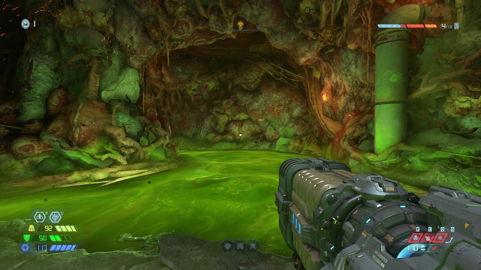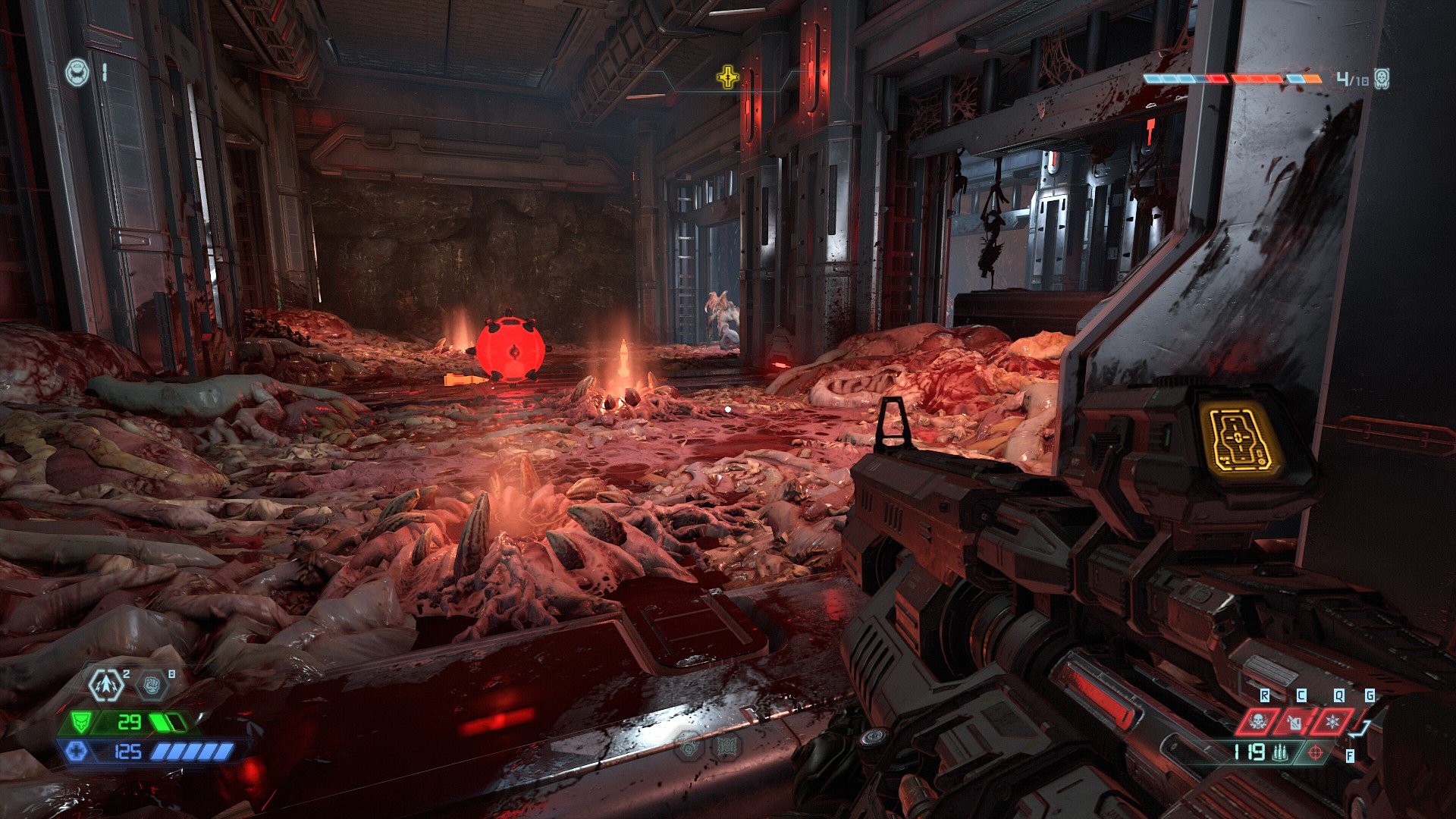 Apagué la brújula y la otra mugre que te dice a dónde ir y no he tenido problemas para orientarme utilizando solo el mapa. Algunos enemigos son unos verdaderos hijos de suchi (en Ultraviolencia) y la cereza del pastel son las "DOOM Gates": niveles ocultos donde hay que sobrevivir la miríada de enemigos que aparece, si se te acaban las vidas hay que empezar de nuevo. Salir vivo de una de estas puertas te deja cansado pero muy satisfecho.