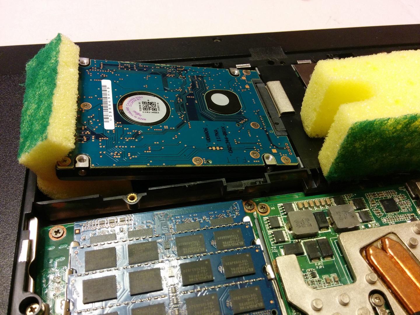 Hoy necesité montar un disco duro adicional a esta laptop pero no tenía otra carcasa que ponerle. Sin la carcasa el disco queda bailando y se puede desconectar. Solución: Comprar una fibra lavatrastes de esponja mas o menos firme por $14 pesos y usarla para sujetar el disco: