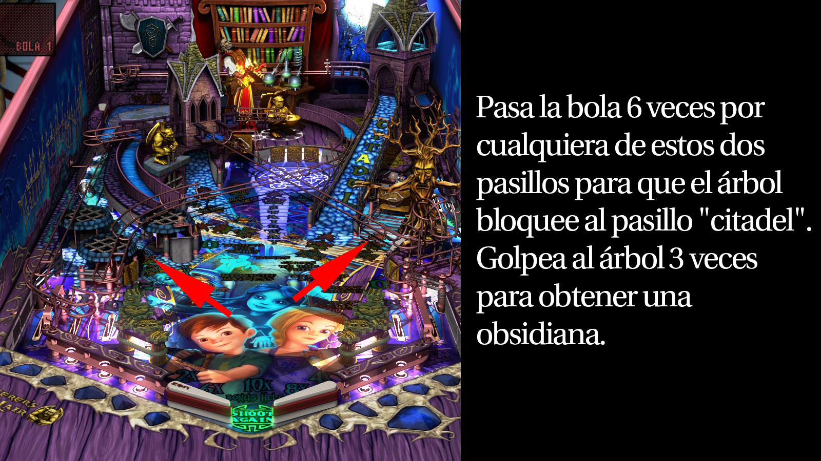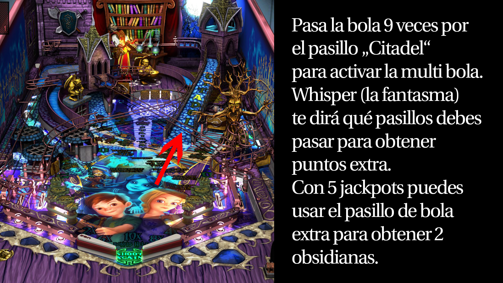 Lograr que entre la bola a la gárgola requiere de práctica, pero la recompensa es bastante buena. Al iniciar la multi bola tendrás la posibilidad de pasar por cualquiera de los 7 pasillos de juego y ganar un millón de puntos por cada uno, así que hay 7 millones en juego. Y al final, si logras pasar por todos los pasillos puedes ocupar el pasillo de bola extra para reclamar una obsidiana.