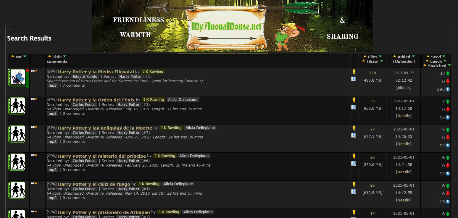 Esta última también sirve para los audiolibros. Más audiolibros se pueden encontrar en audiobookbay.nl (necesitas una cuenta para ver los enlaces) y por último el tracker privado MyAnonaMouse .
