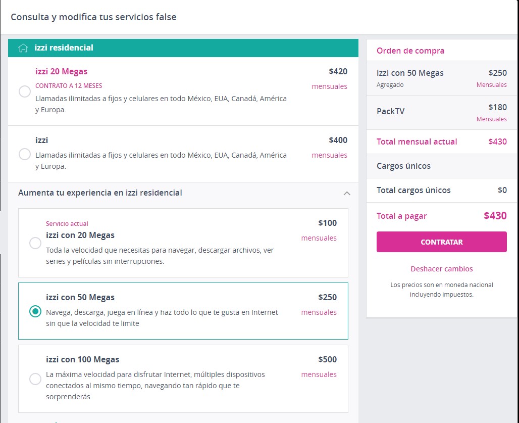 a pagar". luego en letras mas pequeñas abajo te viene "Plan +50Mbps +Plan 100Mbps" y te cobran lo extra por separado y luego otro "subtotal".