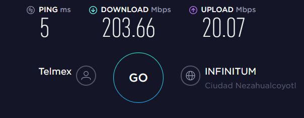 Pero bueno, apagué y volví a encender el router y ya tengo la nueva velocidad con el extra. Es el paquete de $549 de puro internet. Hasta la semana pasada era el que daba 100/10Mbs y que desde el viernes subió a 150Mbs (no sé bien su subida) para actualmente quedar en 200-205/20Mbs.