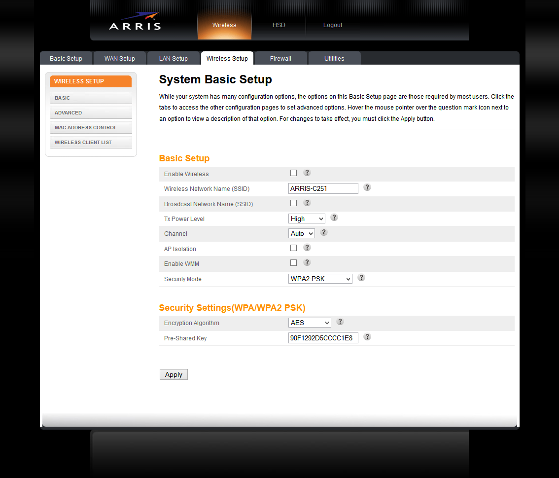 - La página principal de la interfaz del modem presenta los parámetros básicos, desde aqui podemos empezar a configurar el modem. Modifica las opciones como se muestra a continuación y no olvides hacer click en el botón Apply para guardar tus cambios: