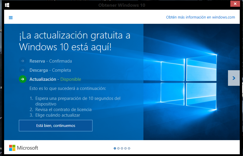 pakitos wrote: Hace como 3 días me salió una leyenda que me dijo que Windows estaba trabajando para que mi equipo fuera totalmente compatible con el nuevo SO. Ayer me salió que ya podía bajar W10 y lo hice pero ya cuando estaba a punto de empezar a instalar me acordé que me conecto a internet mediante un adaptador inalambrico y le saqué.