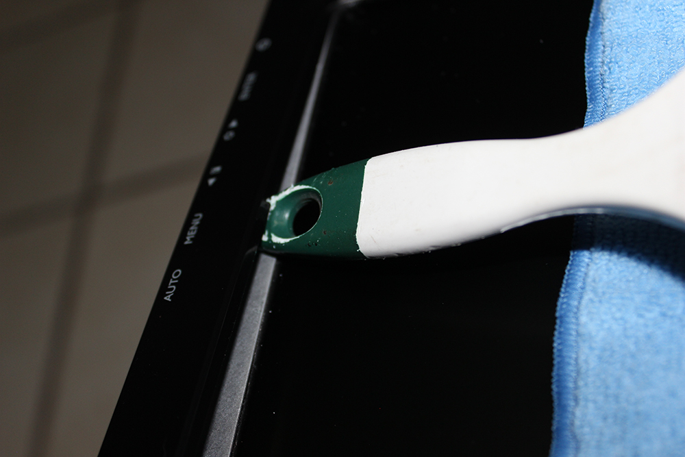 Hay unas herramientas de plastico que se utilizan (sobre todo para la apertura de telefonos celulares) para abrir carcasas plasticas y evitar dañarlas; no se como se llaman pero a falta de una, tome una brocha ccon mango de plastico y me sirvio perfecto