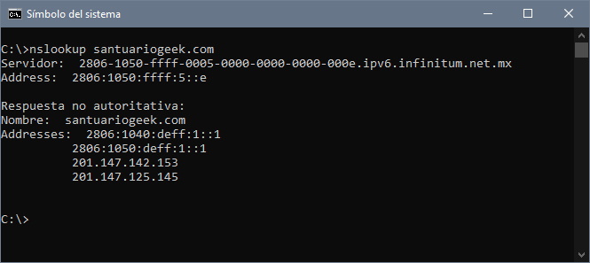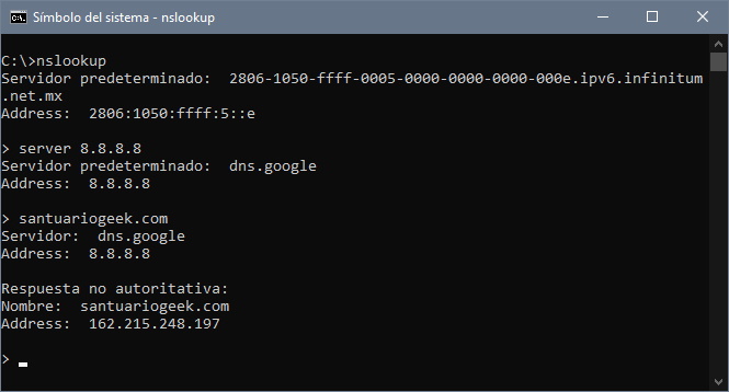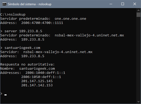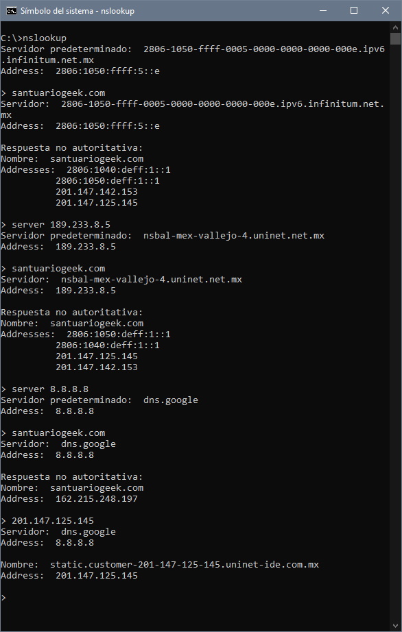 El DNS que Telmex configura en su router tiene la IP 189.233.8.5, comprobemos que en efecto está enviando el tráfico de santuariogeek.com a otro lado: