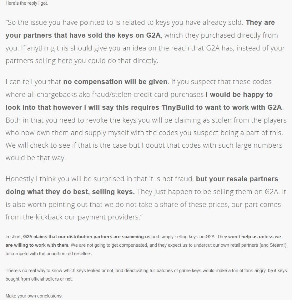 En un correo donde le pedían a G2A explicar de dónde habían salido las llaves estos simplemente contestaron: "Los que te las compraron a ti nos las vendieron, así que no te daremos ninguna compensación. Si crees que ellos las obtuvieron por medio de estafas o fraude podríamos investigar, pero esto requerirá que TinyBuild trabaje con nosotros."