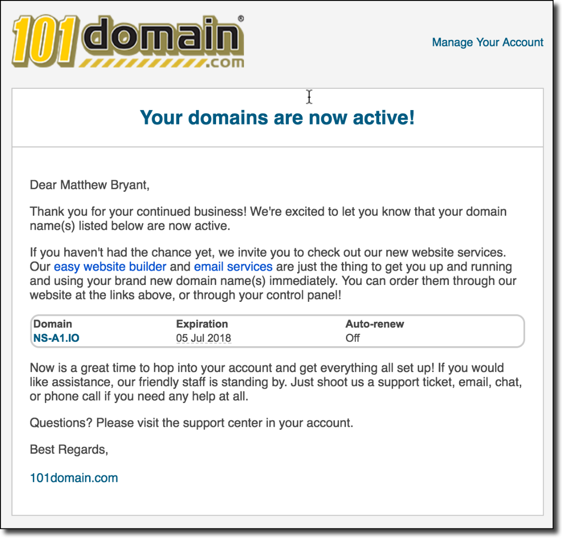 Mandatory procedió a comprar el dominio ns-a1.io por $90 dólares y el miércoles siguiente recibió la notificación de que estaba activo.
