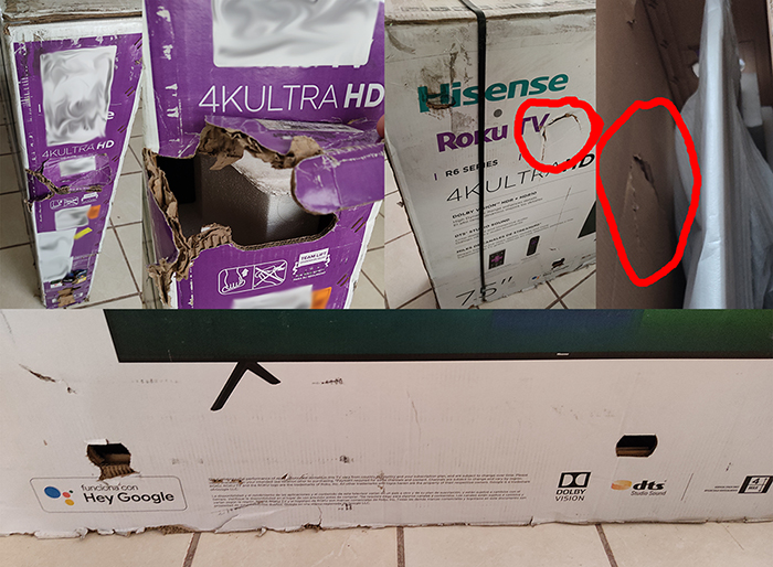 Precisamente me acaba de pasar algo para el caso este pasado "hot sale"...merque una tele y la caja me llego toda puteada y me va que no era todo culpa de paqueteria.