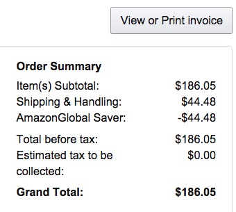Te dejo screenshot del pedido de Julio 2015, fueron 186 dllrs (no exactamente 200). Nos ahorramos "44" USD de envío por el Global Saver, si no, hubieran sido 230. Entregó UPS y no nos cobró impuestos.