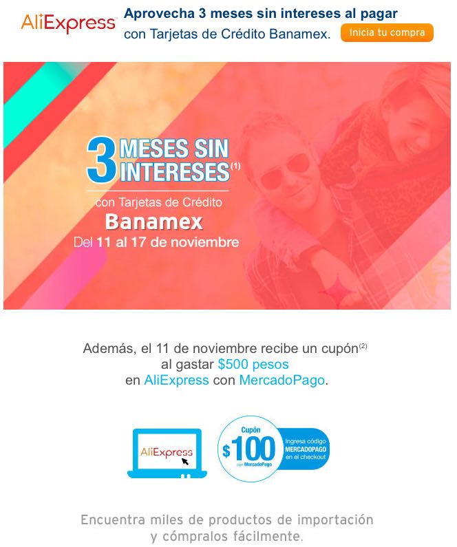 Promo Alie Express - Cupón de $100 en compras de $500 mediante MercadoPago el día Hoy 11 Noviembre 2015