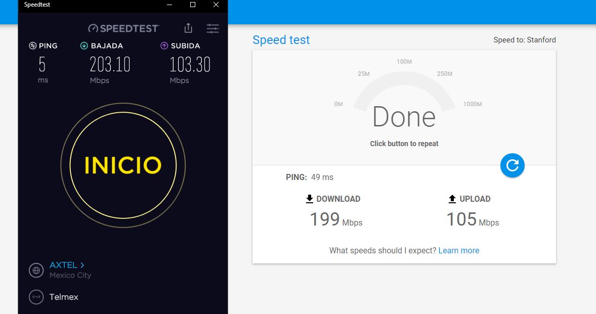 Pero bueno, apagué y volví a encender el router y ya tengo la nueva velocidad con el extra. Es el paquete de $549 de puro internet. Hasta la semana pasada era el que daba 100/10Mbs y que desde el viernes subió a 150Mbs (no sé bien su subida) para actualmente quedar en 200-205/20Mbs.