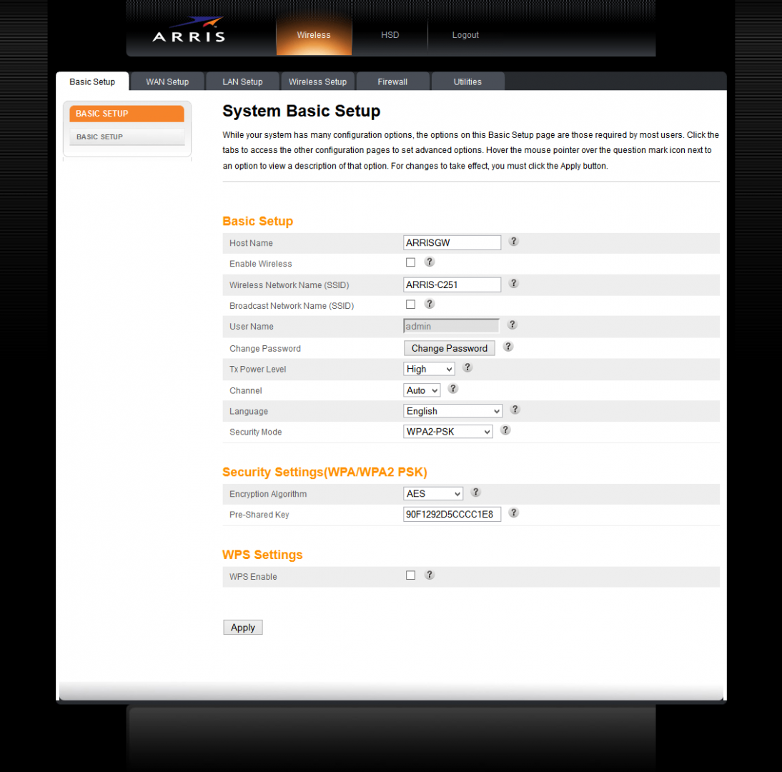 - La página principal de la interfaz del modem presenta los parámetros básicos, desde aqui podemos empezar a configurar el modem. Modifica las opciones como se muestra a continuación y no olvides hacer click en el botón Apply para guardar tus cambios: