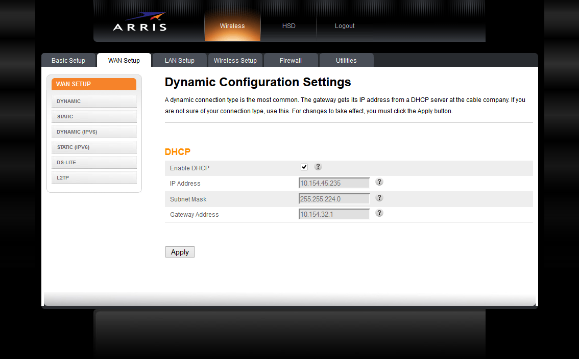- La pestaña WAN Setup contiene los parámetros para la conexión WAN (al exterior), asegúrate de que DHCP esté activado: