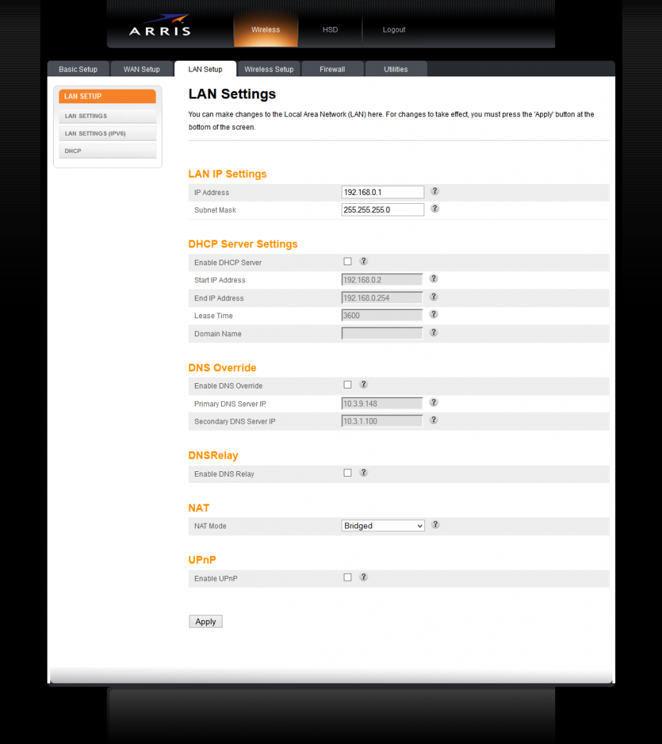 - En la pestaña LAN Setup se configura la red local. Esta es la página mas importante para nuestro objetivo. Desactiva todas las opciones y asegúrate de seleccionar el valor Bridged para la opción NAT Mode. No olvides hacer click en Apply para guardar tus cambios: