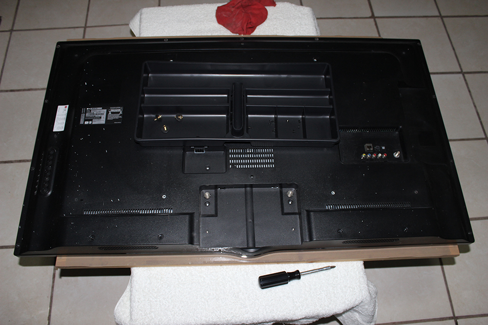 Aca empiezo acostandola de frente, con unos tabloncitos (forradas con cinta canela, para tratar de evitar dañar el plastico) apoyados sobre el marco, para que el panel quede "flotando":